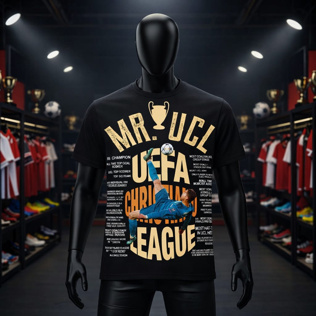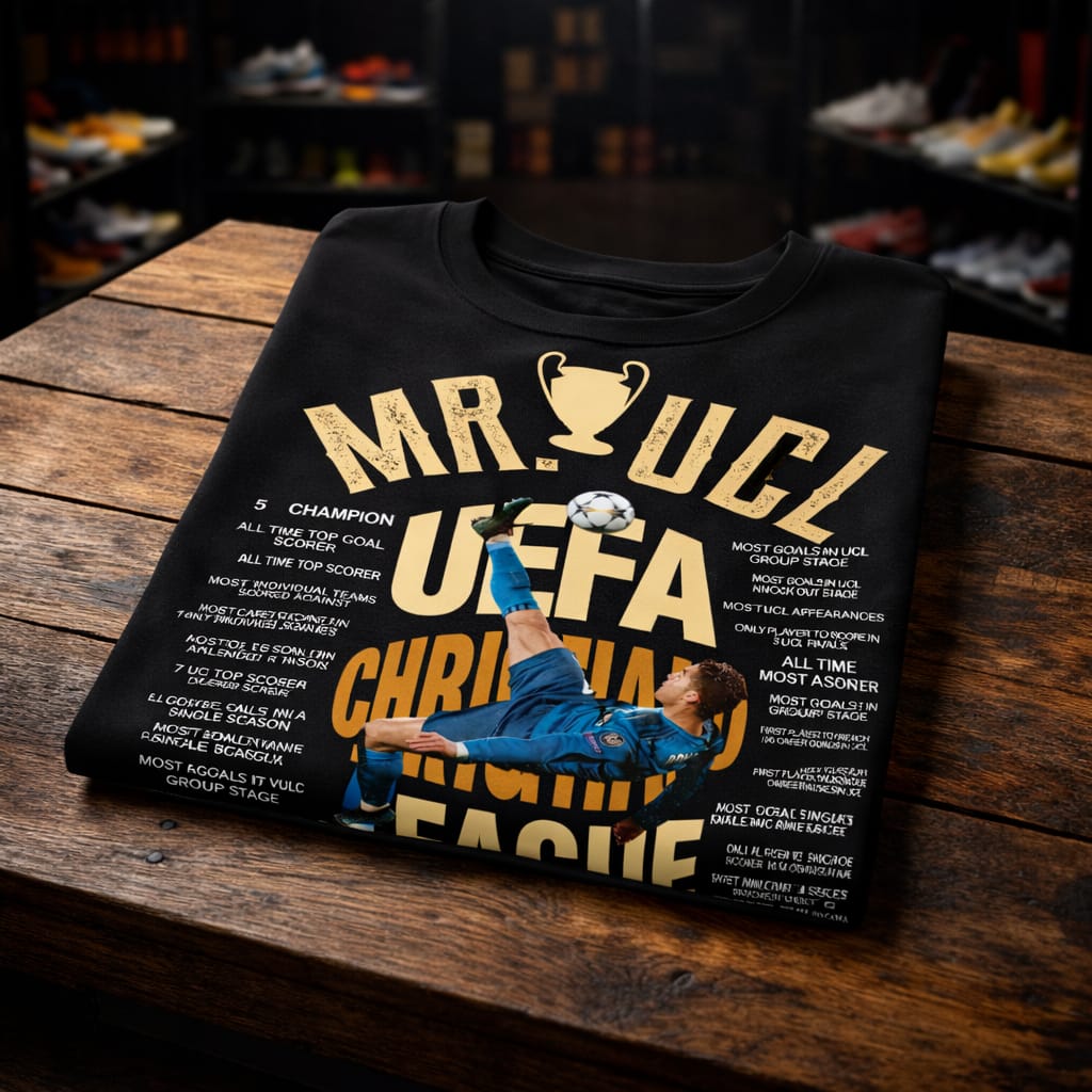 The bold “MR. UCL” graphic pays tribute to Ronaldo’s legendary UEFA Champions League dominance, making it a must-have for football lovers and collectors alike. Whether you’re heading to a match screening, gym session, casual outing, or styling it as streetwear — this tee delivers confidence and comfort in every season.