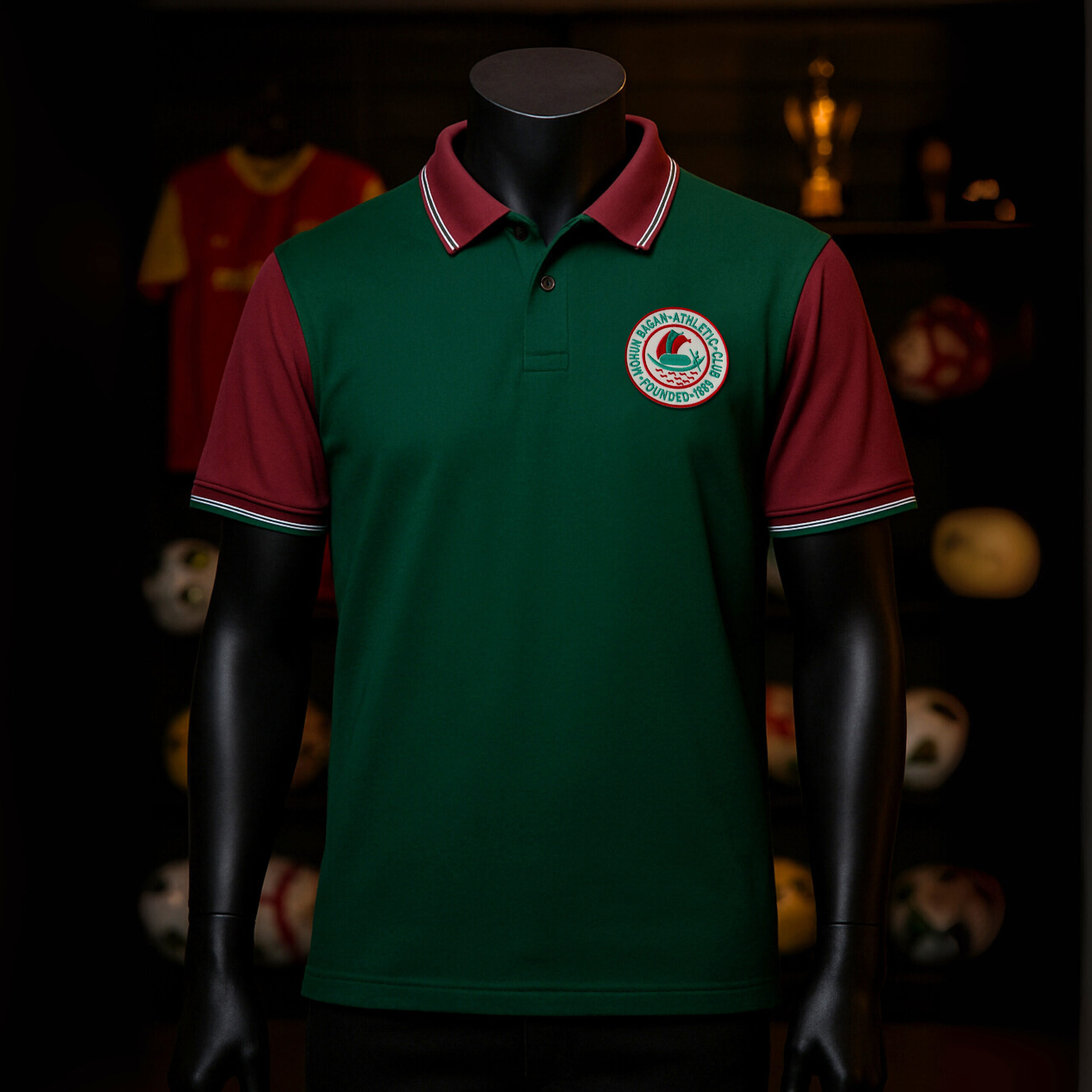 SEO Keywords: Mohun Bagan Polo T-shirt, Mohun Bagan Cotton Polo, Traditional Green Maroon Polo, Embroidered Mohun Bagan Crest, 100% Cotton Fan Polo, Mohun Bagan Heritage Wear.